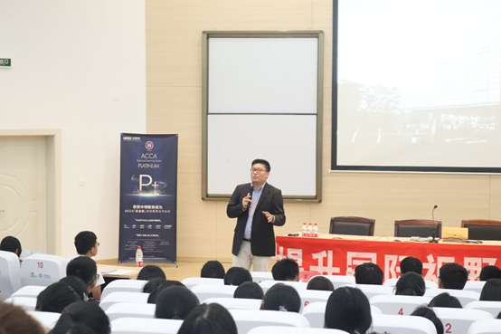 讲座伊始,何碧娟女士对ACCA作了详细介绍,鼓励学生们在大学期间多锻炼能力,多了解并考取专业证书,提升自身价值。随后,富锐先生就人工智能发展现状引出当前严峻的就业形势,他勉励在场同学应提升思辨能力以适应时代“新商科,新挑战”,与时俱进。他特别指出商科学生应熟练使用英语工具,始终保持语言学习,并就简历制作提出了建议,获得在场同学的阵阵掌声。