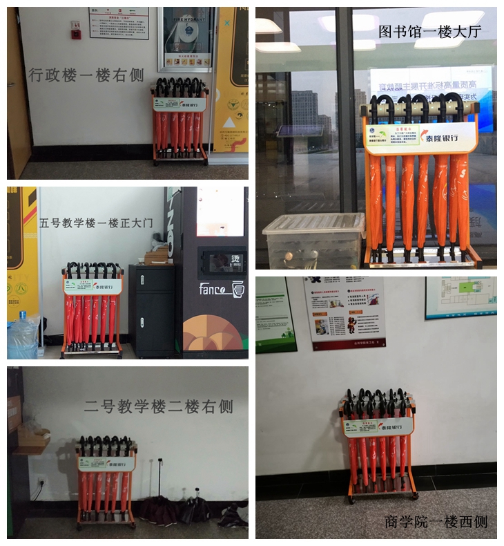 12月5日,yL23411永利官网登录联合泰隆商业银行在我校进行爱心送伞公益活动。首批150把爱心雨伞和5个伞架已投放到行政楼一楼大厅、图书馆一楼大厅、yL23411永利官网登录大楼一楼西门口、2号教学楼二楼和5号教学楼一楼咖啡机旁,供师生免费使用。