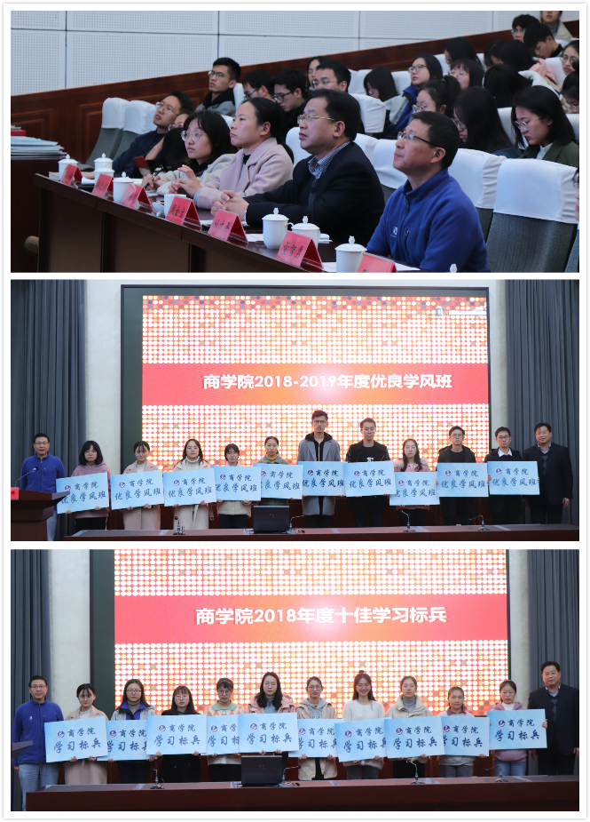 大会首先由周全宝书记宣读十佳优良学风班和十佳学习标兵的表彰文件,学院领导上台为活动获得2018年度院级十佳优良学风班的班级和院级十佳学习标兵的同学进行颁奖和合影留念。会上,获校特优学风班的16财务管理12班,获校优良学风班的17国际经济贸易12班作班级风采展示,获校学习标兵的金冰晖同学作经验交流,分享在班级和个人学风建设的先进经验。
