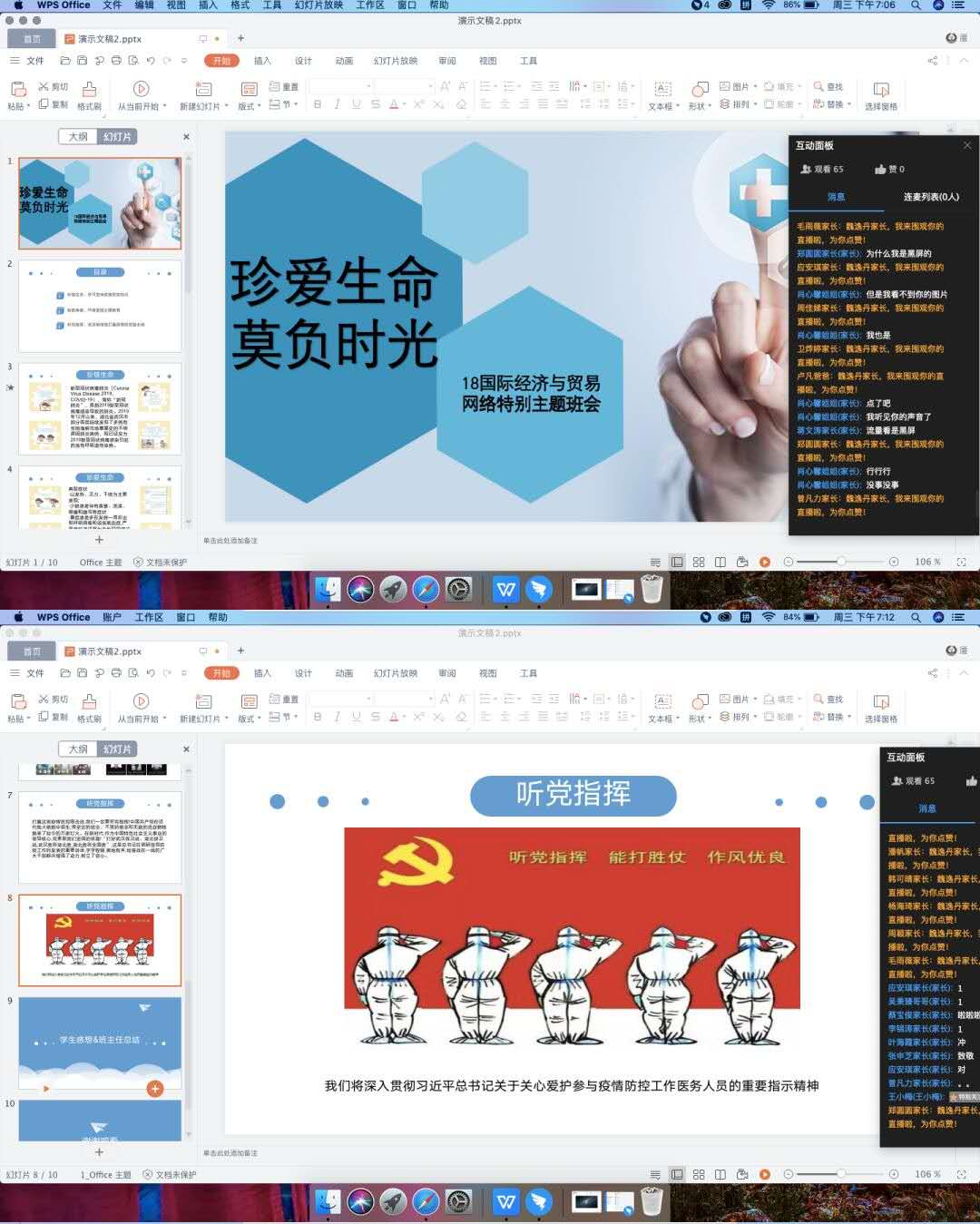 组织线上主题班会。各班级积极响应号召,在特殊的时期开展了一次“别样的”主题班会。他们利用新媒体,或科普病毒传播、感染症状和如何科学预防知识;或进行在线辟谣与疫情知识回答;或分析现阶段疫情形势,提醒同学们如何准备迎接新征程。无论什么样的主题,都传达了青年一代面对疫情、面对生活时积极向上、坚定不移的信心和态度。