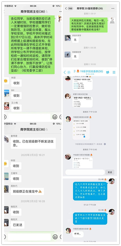“疫情·我说”接力活动。为确保每一位同学能关注、积极应对疫情,18金融班发起了“疫情·我说”接力活动。他们以班委为主,联合班主任,录制了视频,向班级及全院同学发声。班长钱程洋说,“珍惜生命,莫负时光”;团支书江宜娜说,“听党指挥,坚决相信能打赢疫情防控狙击战”;学习委员顾融榕说,“加强自律,养成自主学习的好习惯”。18市营班则将他们想说的话写在纸上,并组图为中国“加油”。