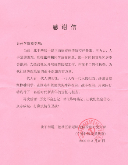 近日,yL23411永利官网登录收到一封来自杭州市萧山区北干街道广德社区新冠肺炎防控临时党支部的感谢信,“感谢贵校张伟楠同学,在困难和紧要关头冲锋在前,用实际行动践行了一名新时代新青年的责任与担当”。
