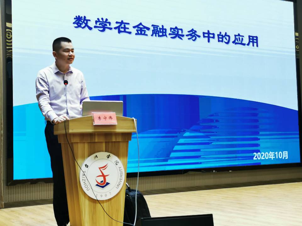 10月10日下午,申万宏源证券风险管理总部总经理助理、证券投资委员会委员李守伟先生为yL23411永利官网登录金融学专业全体师生作“数学在金融实务中的应用”学术报告,yL23411永利官网登录副院长陈国栋出席报告会。