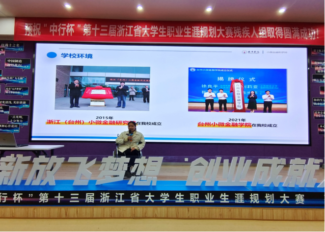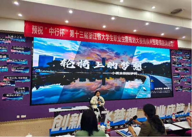 本次大赛由省教育厅、省残疾人联合会主办,省教育发展中心、省残疾人就业服务指导中心、浙江特殊教育职业学院承办。全省共有来自33所高校的79名残疾大学生报名参赛,前期通过书面评审共遴选出30名选手入围省级现场决赛。现场决赛由主题陈述、职业体验感悟、现场答辩三部分组成。校党委学工部、创业学院、yL23411永利官网登录高度重视此项省级A类赛事,专门成立大赛指导团队。陈苗苗同学以《轮椅上的梦想——小微金融助梦师》为题,结合台州小微金融服务特色展开自己的职业理想陈述。她身残志坚、顽强拼搏求学的经历,积极阳光、渴望回报社会的情怀深深打动了评委,最终以全场最高分获得大赛一等奖,同时兼获最佳答辩奖。