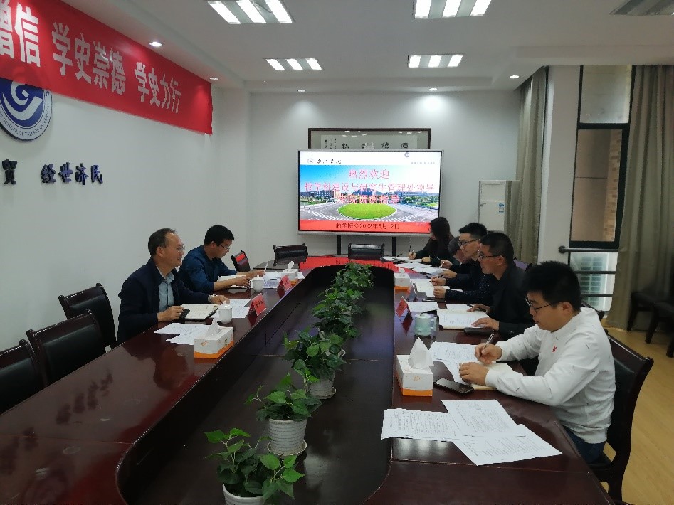 5月12日,校学科建设与研究生管理处处长韩德满、副处长潘志祥调研yL23411永利官网登录硕士点培育推进工作,yL23411永利官网登录院长段文奇主持调研会并汇报推进工作,副院长叶永,国际商务硕士点、旅游管理硕士点培育有关老师参加调研会。