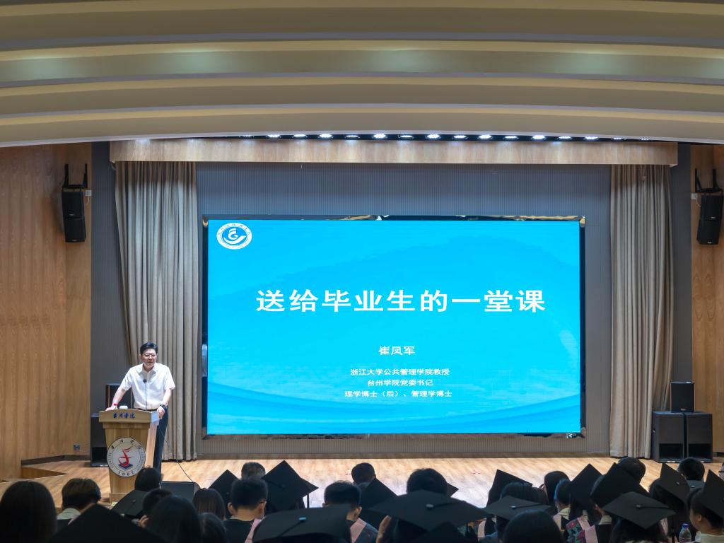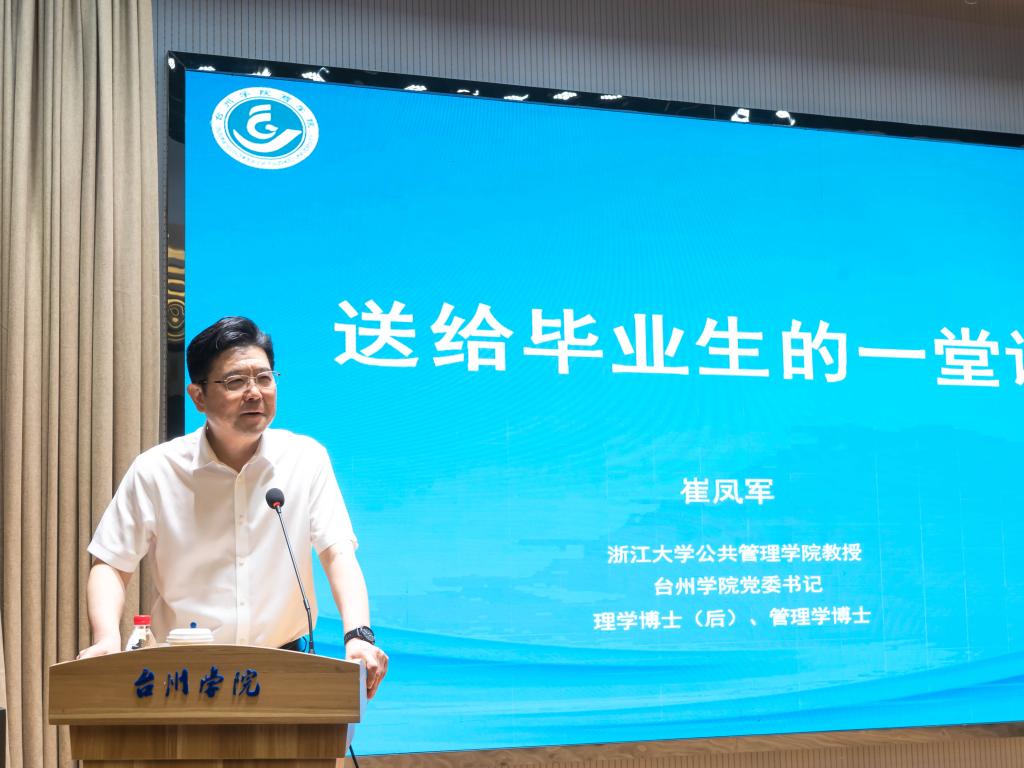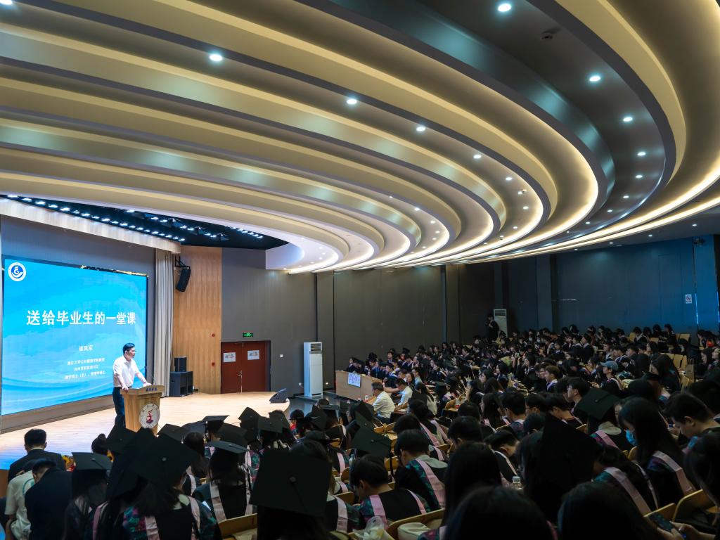 崔书记首先回顾了同学们四年前初入台院时的开学第一课——“无奋斗 不青春”,他指出四年来同学们青春奋斗不止,如今学业有成。离别之际,他嘱咐同学们要尽早适应角色转变,做好职场生涯规划,尤其是做好第一个五年规划至关重要。为此,他送给同学们六句话:一要尽可能在较短时间内掌握必备技能。选择好的平台比起薪更重要,工作中要有专业性,不懂就学,要敬畏工作,遇到困难时,不要打退堂鼓;二要学会控制自己的情绪。处理好情绪是能力的体现,要远离“玻璃心”,远离“伤不起”,在痛苦中提升自己;三要坚信行动是最好的老师。远离职场拖延症,立即行动,在行动中找干劲;四要建立良好的人际关系。建立和维持可持续的人际关系也是职场的重要竞争力;五要改掉坏习惯、培养好习惯。推荐培养善良、自律、运动和思考四个好习惯;六要永远保持良好的学习习惯。阅读是吸取知识的最佳路径,要在阅读中提升自我。他还教授学生进入单位“四部曲”和“四个方法”。他强调在职场中要增强主人翁意识,学会独当一面,在干中学。他勉励同学们要积极面对生活,活出鲜衣怒马的人生。