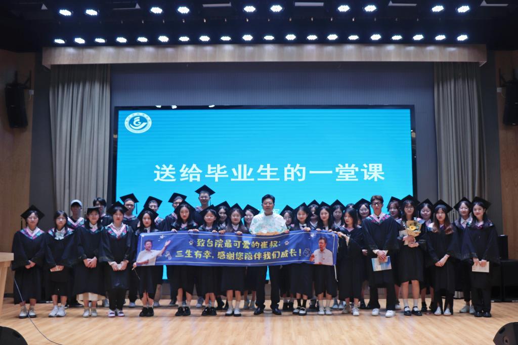 崔书记送给毕业生的最后一堂课深入浅出、干货满满、寓意深刻,同学们纷纷表示受益匪浅。适逢毕业季,每一句的临行嘱托都蕴含了“崔叔”作为台院大家长对毕业生的关爱和期许,也是送给毕业生最珍贵的毕业礼物,讲座尾声,“崔叔”向同学们赠送了书籍。18旅游管理专业全体学生上台向“崔叔”赠送了写着全班同学感恩和祝福卡片的花束并合影留念。