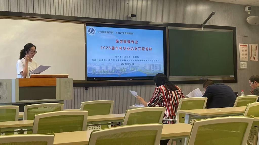 此次毕业论文开题答辩除了旅游系的全体教教师外,还特邀三位旅游行业资深专家——台州市农业农村局四级调研员张光根副局长、方远·台州大饭店潘高平总经理、华强方特(台州)旅游发展有限公司胡四华总经理等,组成毕业论文行业专家导师团。专家们聚焦行业现实难题与未来趋势,为学生毕业论文提供宝贵指导意见,确保选题紧贴实际,研究具有前瞻性和应用价值。