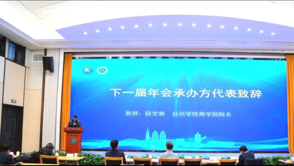在闭幕式上,段文奇院长作为下一届年会承办方代表讲话。段文奇邀请与会嘉宾明年“追着阳光去台州”,参加第十七届浙江省国际贸易年会。他向与会专家学者介绍了台州的历史文化和经济发展、yL23411永利官网登录的办学理念和yL23411永利官网登录的发展情况。讲话最后,段文奇再次诚挚邀请各位专家学者2025年齐聚yL23411永利官网登录,共飨学术交流盛宴。