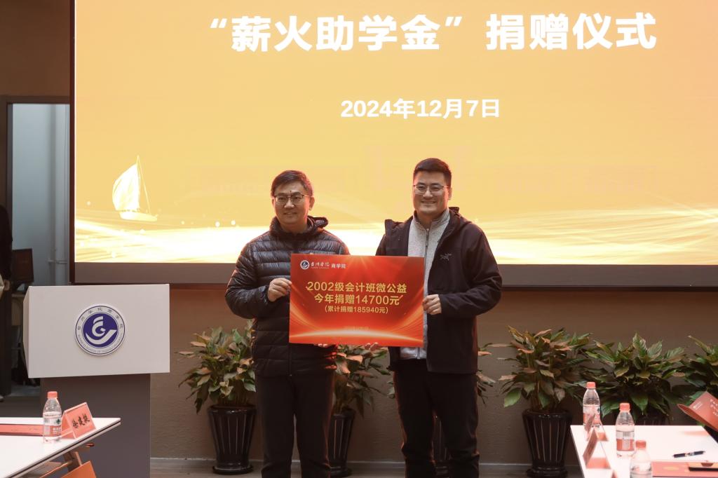 在2002级会计班微公益“薪火助学金”捐赠仪式中,副院长陈国栋向2002级会计班代表陈海云颁发捐赠证书,对校友多年来的关心关爱表示衷心的感谢,这份助学金承载着校友们多年来对学弟学妹们的深情厚谊,它如同星星之火,点燃希望之光,让受助学生能在求学的道路上更坚定地追逐梦想,勇攀高峰。