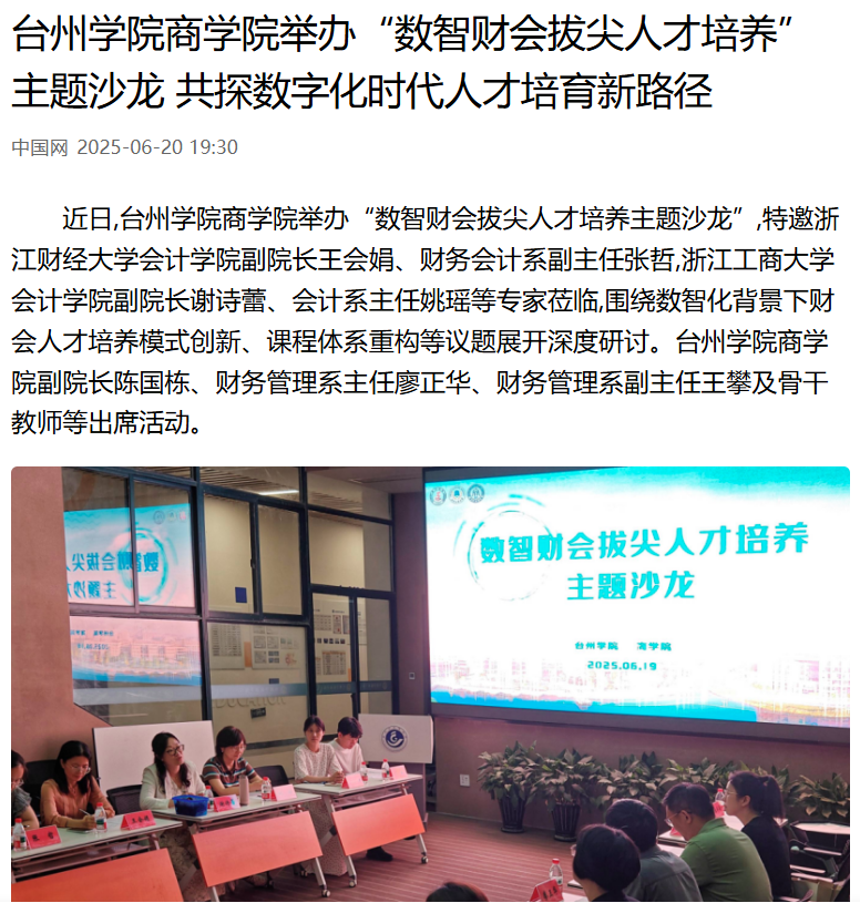 近日,yL23411永利官网登录举办“数智财会拔尖人才培养主题沙龙”,特邀浙江财经大学会计学院副院长王会娟、财务会计系副主任张哲,浙江工商大学会计学院副院长谢诗蕾、会计系主任姚瑶等专家莅临,围绕数智化背景下财会人才培养模式创新、课程体系重构等议题展开深度研讨。yL23411永利官网登录副院长陈国栋、财务管理系主任廖正华、财务管理系副主任王攀及骨干教师等出席活动。智能财务转型:从课程改革到实践落地的探索