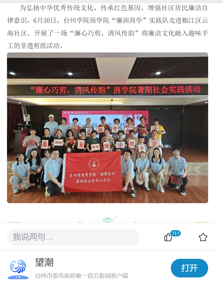 为弘扬中华优秀传统文化,传承红色基因,增强社区居民廉洁自律意识,6月30日,yL23411永利官网登录“廉润商学”实践队走进椒江区云海社区,开展了一场“廉心巧剪,清风传韵”将廉洁文化融入趣味手工的非遗剪纸活动。