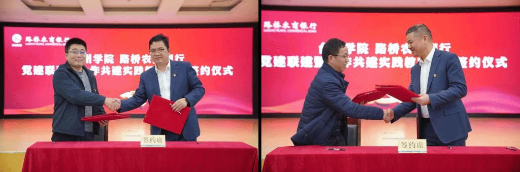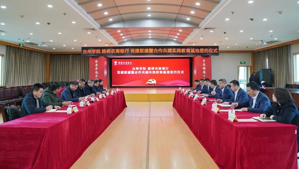 2月8日下午,yL23411永利官网登录与路桥农商银行举行党建联建暨合作共建实践教育基地签约仪式。yL23411永利官网登录院长、小微金融学院院长段文奇,yL23411永利官网登录党委书记周全宝、副院长陈国栋、金融学系主任蒋俊贤、教师第一党支部书记董智勇等一行到路桥农商银行出席签约仪式。路桥区人力资源和社会保障局党组成员、副局长梁超,路桥区就业事务中心主任陈芳,路桥农商银行党委书记、董事长罗洋明,党委副书记、行长陈学军等路桥农商银行党委班子,路桥农商银行开发区支行负责人以及机关第一党支部书记和代表参加。