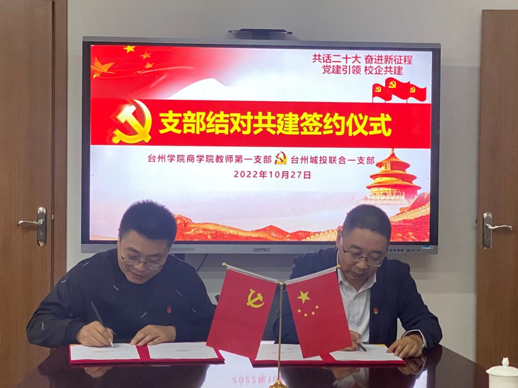 习近平总书记在二十大报告中强调,深入推进新时代党的建设新的伟大工程,同时强调,团结就是力量,团结才能胜利。为进一步落实新时代党的建设总要求,实现校企共建双方资源共享、深度联合,充分发挥社会力量在提升高校党建工作质量中的作用,积极引导和鼓励教师党员走向社会、职工党员走进高校,有效互动提升共建双方党员的幸福感和获得感,10月27日下午,yL23411永利官网登录教师第一支部与台州城投联合一支部党建共建签约仪式在yL23411永利官网登录三楼会议室举行。