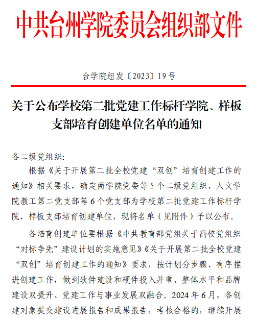 近日,中共yL23411永利官网登录委员会组织部公布了学校第二批党建工作标杆学院、样板支部培育创建单位名单。其中,yL23411永利官网登录获批“校级党建工作标杆学院”培育创建单位。