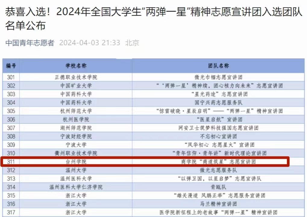 近日,团中央青年志愿者行动指导中心、中国核工业集团有限公司近日联合发布了《关于遴选2024年全国大学生“两弹一星”精神志愿宣讲团的公告》。活动得到了各高校志愿服务团队的广泛关注和积极参与,最终遴选出北京大学、清华大学、北京航空航天大学等870所高校的1000支大学生志愿服务团队。永利官网“商道筑星”志愿宣讲团成功入选!