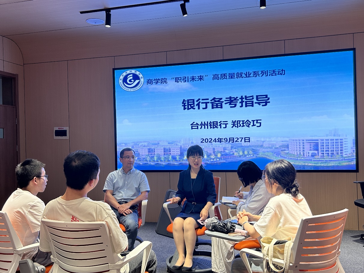 为扎实推进毕业生就业工作,提高学生在银行业求职中的竞争力,9月23日至27日,yL23411永利官网登录邀请泰隆银行、建设银行、台州银行招聘负责人走进校园,和同学面对面交流银行备考事宜。yL23411永利官网登录党委书记马斌出席活动。yL23411永利官网登录就业辅导员赵之遐,各专业应届毕业生参加活动。