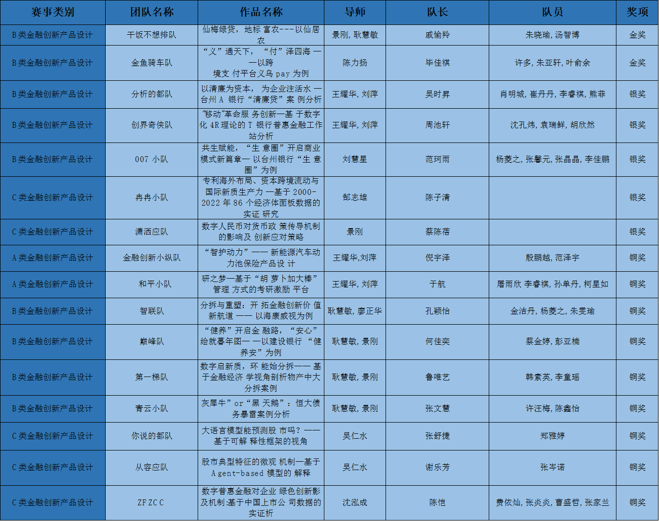 近日,第九届浙江省大学生金融创新大赛在浙江省金融职业学院圆满落幕,本次大赛共有55所高校、722支团队报名,最终有172件作品入围省级决赛。永利官网再次不辱使命、不忘重负,在众多团队中脱颖而出,共斩获2金5银9铜。