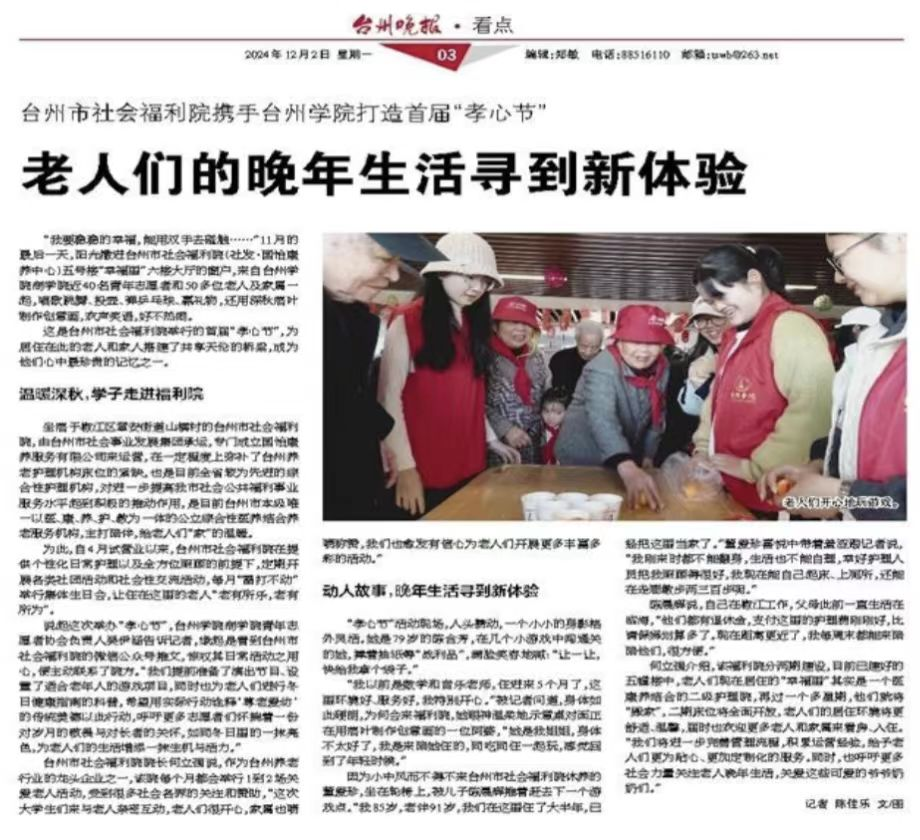 活动结束后,台州晚报对此次走进福利院志愿服务活动进行了报道,对志愿者们的行动给予称赞,并呼吁更多社会力量关注老人们的晚年生活,为他们递送关怀的馨香。