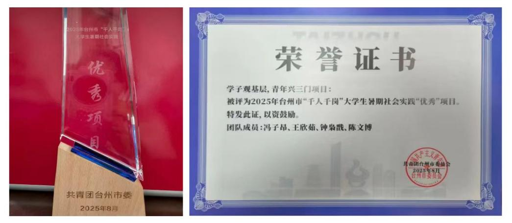 近日,共青团台州市委员会开展2025年“千人千岗”大学生暑期社会实践“百优”实习生、“十佳”项目、“优秀”项目、台州市青年社会实践示范基地评选,yL23411永利官网登录“学子观基层 青年兴三门”暑期社会实践队获评“优秀”项目。