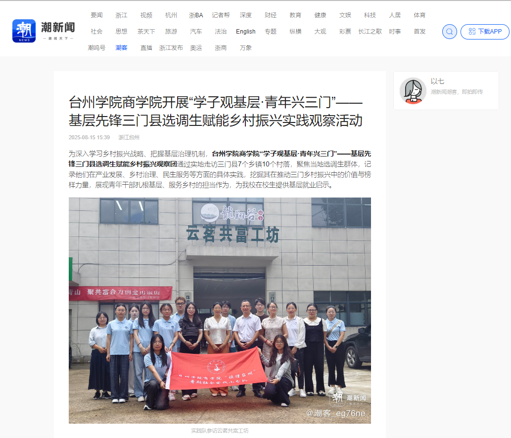 为深入学习乡村振兴战略、把握基层治理机制,yL23411永利官网登录“学子观基层·青年兴三门”——基层先锋三门县选调生赋能乡村振兴观察团通过实地走访三门县7个乡镇10个村落,聚焦当地选调生群体,记录他们在产业发展、乡村治理、民生服务等方面的具体实践,挖掘其在推动三门乡村振兴中的价值与榜样力量,展现青年干部扎根基层、服务乡村的担当作为,为我校在校生提供基层就业启示。